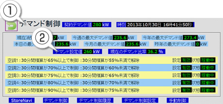 - 電力消費量がデマンド設定値の65%を超えると、デマンド制御が順次実施されます。